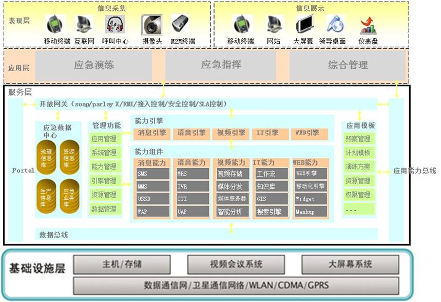為了能夠構(gòu)建統(tǒng)籌規(guī)劃、統(tǒng)一標(biāo)準(zhǔn),實(shí)現(xiàn)平戰(zhàn)結(jié)合高效實(shí)用,同時(shí)具備技術(shù)先進(jìn)且安全靈活的機(jī)制,結(jié)合互聯(lián)互通、資源共享的要求,構(gòu)建了綜合應(yīng)急演練與指揮體系。